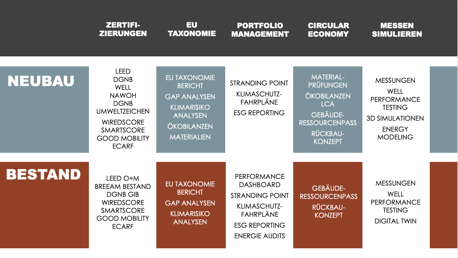 Ein nachhaltiges Selbstverständnis in der Bauchbranche und Immobilienwirtschaft ist für uns eine sehr ernsthafte und drängende Vision. Deshalb helfen wir unseren Kunden u. a. beim Erreichen der ESG-Ziele für Gebäude, die sie im In- und Ausland entwickeln und verwalten.