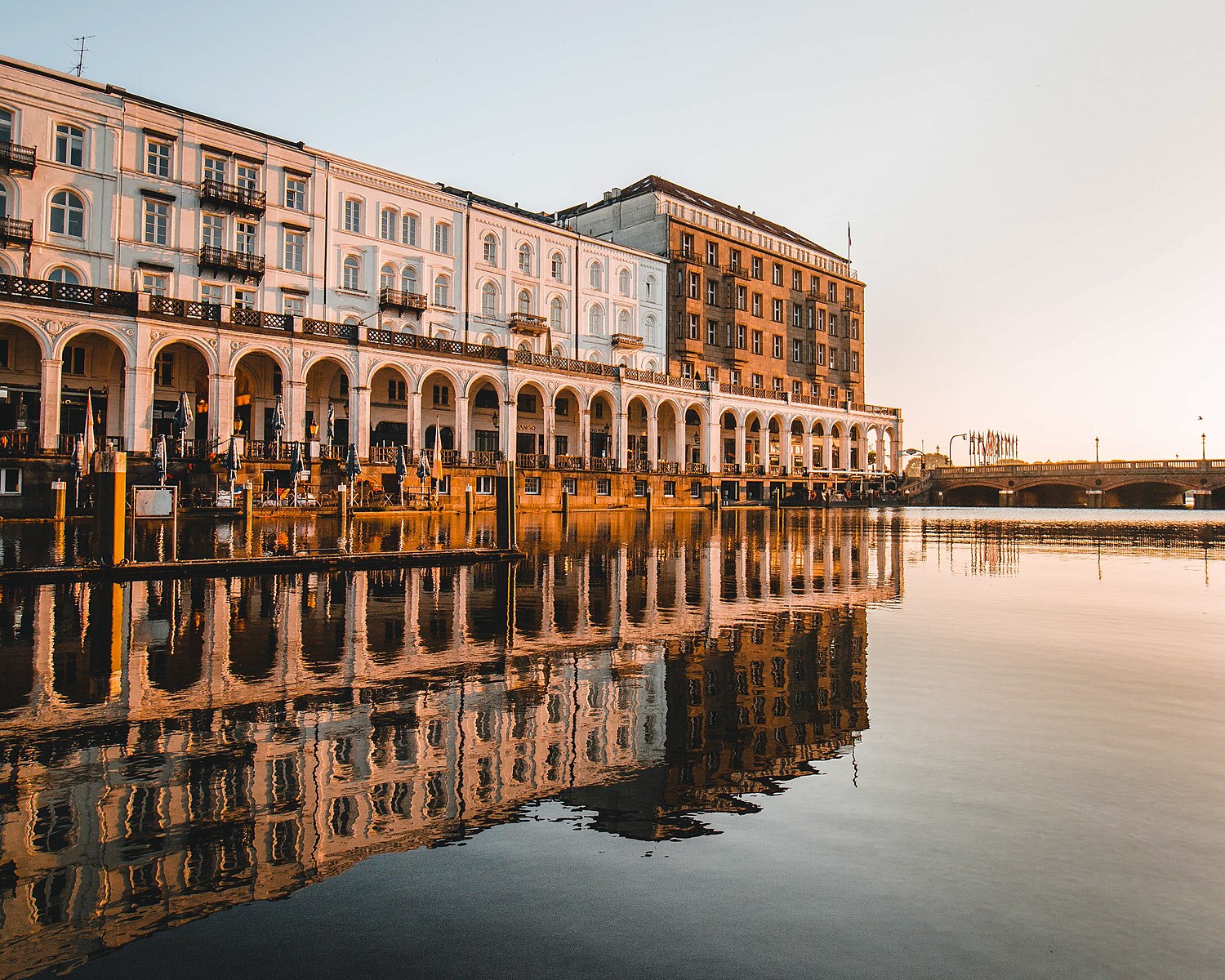 Bildquelle: https://commons.wikimedia.org| The Alsterarkaden in Hamburg at sunrise (cropped) - Vincent Seydel-Winter| Lizenz:CC BY-SA 4.0 DEED Attribution-ShareAlike 4.0 International